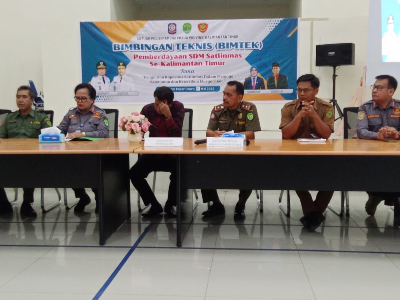 Hadir sebagai narasumber dalam bimtek ini antara lain Kasatpol PP Provinsi Kalimantan Timur, Kasatpol PP Kabupaten Penajam Paser Utara, Perwakilan Badan Penanggulangan Bencana Daerah (BPBD), Dinas Komunikasi dan Informatika Provinsi Kalimantan Timur, Dinas Kesehatan.